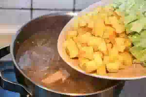 7. В кипящий бульон с мясом положить картофель. Проварить около 7-10 минут на небольшом огне. Не давайте бульону сильно кипеть!