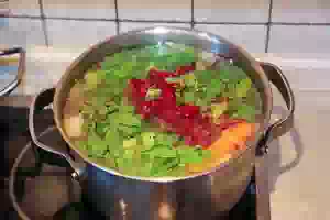 9. Спустя 5 минут положите в суп свеклу вместе с ботвой и варить 5-7 минут.