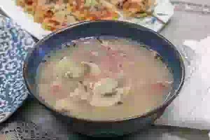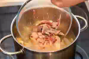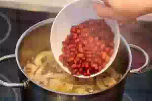 1. Сушеную красную или белую фасоль промыть, залить холодной водой, добавить полчайной ложки соды и оставить на ночь. Перед варкой фасоль обязательно промыть, сложить в кастрюлю, залить холодной водой, довести до кипения и варить без соли примерно 20 минут. Или взять для супа готовую консервированную фасоль. Сварить куриный бульон. Для этого мясо на кости сложить в кастрюлю, залить холодной водой, добавить очищенную луковицу, морковь, стебли укропа. Поставить кастрюлю на средний огонь, и как только вода начнет закипать, уменьшить нагрев до минимального. Продолжать варить бульон, снимая пену шумовкой. Бульон будет вариться на слабом огне не менее 1 часа. Когда перестанет образовываться пена, посолить бульон по вкусу, положить горошины перца и лавровый лист. Из готового бульона выловить зелень, луковицу и морковь. Процедить мясной бульон в чистую кастрюлю. Мясо отделить от кости, убрать на время в сторону. Вернуть кастрюлю с бульоном на небольшой огонь.