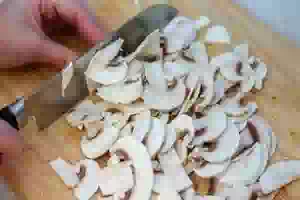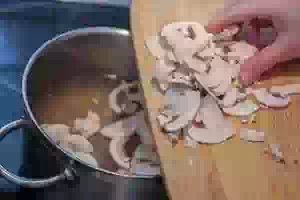 2. Пока варится бульон и фасоль, почистить грибы и нарезать их пластинами.
