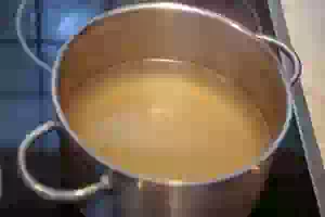 1. Сушеную красную или белую фасоль промыть, залить холодной водой, добавить полчайной ложки соды и оставить на ночь. Перед варкой фасоль обязательно промыть, сложить в кастрюлю, залить холодной водой, довести до кипения и варить без соли примерно 20 минут. Или взять для супа готовую консервированную фасоль. Сварить куриный бульон. Для этого мясо на кости сложить в кастрюлю, залить холодной водой, добавить очищенную луковицу, морковь, стебли укропа. Поставить кастрюлю на средний огонь, и как только вода начнет закипать, уменьшить нагрев до минимального. Продолжать варить бульон, снимая пену шумовкой. Бульон будет вариться на слабом огне не менее 1 часа. Когда перестанет образовываться пена, посолить бульон по вкусу, положить горошины перца и лавровый лист. Из готового бульона выловить зелень, луковицу и морковь. Процедить мясной бульон в чистую кастрюлю. Мясо отделить от кости, убрать на время в сторону. Вернуть кастрюлю с бульоном на небольшой огонь.