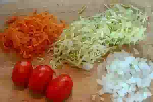 2. Для овощной зажарки кабачки и морковь нарезать маленькими кубиками или соломкой (можно использовать терку для корейской моркови). Лук мелко порубить.
