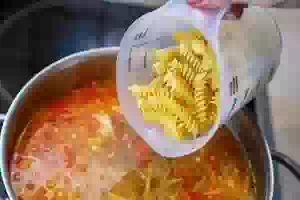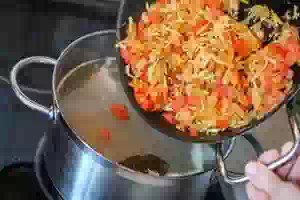 6. Отправить овощную пассеровку в суп. Как только суп повторно закипит, уменьшить огонь и варить 5 минут.