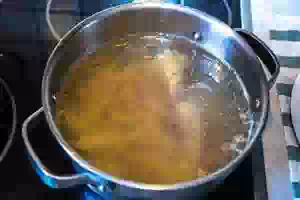 1. Сначала сварить куриный бульон. Курицу или её части (ножки, крылышки, грудку) вымыть под проточной холодной водой, положить в кастрюлю, залить холодной водой и поставить на средний огонь. Как только вода начнет закипать, снизить огонь до минимума и варить, снимая пену шумовкой, не менее 1 часа. Когда перестанет образовываться пена, посолить и поперчить бульон по вкусу. Готовый бульон процедить. Мясо из супа переложить на тарелку, отделить от костей и отложить в сторону.