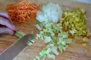 2. Пока варится куриный бульон, подготовить овощи для супа. Очищенную морковь порезать тонкой соломкой. Лук мелко порубить. Сладкий перец разрезать пополам, удалить семена и перегородки, порезать небольшими полосками. Стебли сельдерея порезать на кусочки длиной около 1 см.
