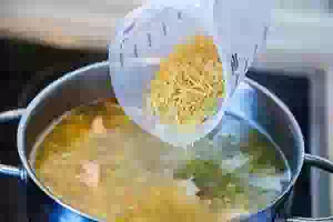 3. Нарезанные овощи переложить в тихо кипящий куриный бульон. Как только суп повторно закипит, продолжить варить его на слабом огне 20 минут.