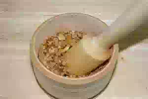 2. В ступке размять очищенные грецкие орехи, после чего смешать с измельченным чесноком.
