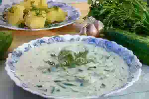 3. Взбить йогурт, добавить огурцы и стертые в ступке вместе с чесноком орехи. Заправить по вкусу растительным маслом и посолить. Хорошо перемешать, при желании, чтобы тартор был более жидким, развести холодной кипяченой водой. Перед подачей на стол посыпать мелко рубленной зеленью укропа.