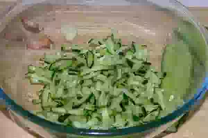 1. Огурцы порезать мелкими кубиками или натереть на крупной терке.