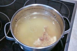 1. Мясо на косточке промыть под проточной холодной водой, положить в кастрюлю, залить холодной водой и поставить на огонь. Как только вода начнет закипать, уменьшить нагрев до минимального и варить около 1 часа, снимать шумовкой пену. Когда пена перестанет образовываться, посолить бульон, добавить 1 очищенную морковь, 1 луковицу, стебли укропа и петрушки. Продолжать варить на слабом огне. Спустя час вареное мясо достать из кастрюли, отделить от костей. Бульон процедить, выбросить луковицу, морковь и зелень. Бульон вернуть в чистую кастрюлю, добавить мясо и поставить на плиту. Как только суп повторно закипит, уменьшить огонь.