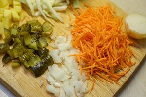 2. Пока варится бульон, подготовить овощи и остальные мясные продукты для супа. Лук и морковь очистить. Лук мелко нарезать, морковь натереть на крупной тёрке или нарезать соломкой. Соленые огурцы нарезать небольшими кубиками.