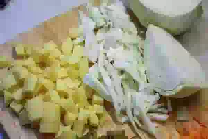 3. Картофель очистить, нарезать кубиками. Свежую белокочанную капусту нашинковать, как вам больше нравится.