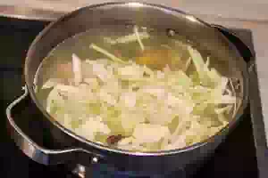 4. В кипящий бульон отправить сначала картофель, проварить 5 минут после закипания и положить в кастрюлю капусту.