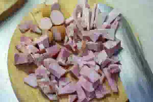 5. Мясные продукты (колбаски, сосиски, ветчину, буженину) нарезать примерно одинаково.