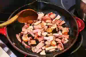 6. В сковороде разогреть растительное масло и частями добавлять мясные продукты, слегка их обжаривая.
