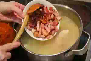7. Переложить обжаренные мясные продукты в кастрюлю с супом.