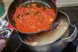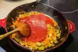 8. В сковороду, где обжаривались колбаски, добавить немного растительного масла и пересыпать подготовленные овощи. Помешивая, обжаривать несколько минут. Теперь можно добавить в сковороду томатную пассату, влить примерно ковшик супа и томить содержимое сковороду на слабом огне примерно 3-4 минуты. Вместо пассаты можно взять томатную пасту.
