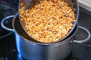 1. Дробленый горох промыть, замочить в холодной воде с добавлением 1 ч.л. соды на ночь.