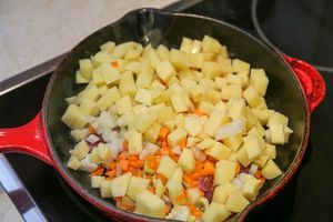 6. Следом отправить в сковороду рубленый лук, измельченные морковь, сельдерей и картофель кубиками. Обжаривать, помешивая, до мягкости овощей примерно 15 минут.