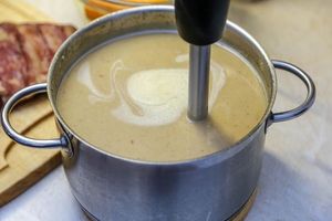 9. Готовый суп пюрировать погружным блендером. При необходимости добавить еще немного бульона или воды, чтобы суп получился желаемой консистенции, и после этого проварить еще 5 минут.