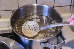 6. В глубокой сковороде или сотейнике разогреть масло. Уменьшить нагрев и добавлять в масла клёцки. Жарить их с двух сторон до хорошего румянца. В идеале клецки жарят во фритюре, но мне что-то стало жалко масло. Всё равно в супе они еще раз проварятся и дойдут до полной готовности.