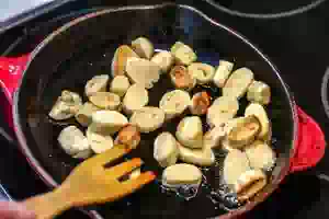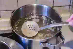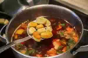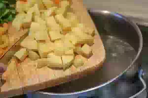 9. В кипящий бульон положить картофель. Дождаться, когда бульон повторно закипит, уменьшить огонь и варить под крышкой 5 минут.