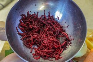 7. Молодые свёколки вымыть, очистить натереть на крупной терке (или соломкой).