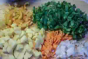 8. Овощи и зелень вымыть и обсушить. Картофель, сладкий перец и морковь очистить, порезать кубиками (морковь можно натереть соломкой). У свекольной ботвы отрезать стебли. Стебли нарезать кубиками, листья - нашинковать полосками, как капусту. Репчатый лук и свежую зелень мелко порубить.