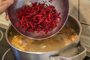 10. Добавить в суп нарезанные свекольные стебли, тертую свеклу, остальные овощи (кроме свекольной ботвы) и мясо. Продолжать варить на слабом огне 5-7 минут.