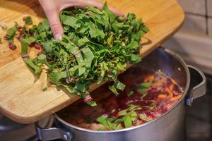 11. Добавить нашинкованную свекольную ботву и зелень. Довести до кипения, уменьшить огонь и варить несколько минут.