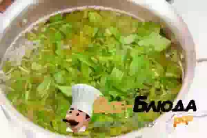 4. Добавляем щавель в кастрюлю, ждем пока цвет станет от яркого изумрудного до хаки. Солим, перчим. Варить около 7 минут, добавляем мелко порезанную зелень и выключаем огонь.