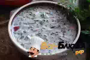 8. Добавляем кефир и минеральную воду. Очень хорошо всё перемешать, чтобы вся желтковая масса разошлась по окрошке. Отдельно к окрошке подайте сметану.