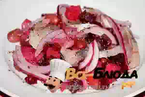3. Тем временем сельдь разделать на филе, нарезать полосками или кубиками. Добавить к подготовленным овощам мелко нашинкованное яблоко, лук и сельдь, осторожно посолить. Смешать масло, уксус, горчицу и заправить винегрет.