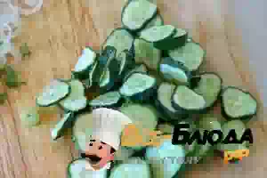 1. Овощи и зелень вымыть под проточной водой и обсушить на полотенце. Огурец порезать тонкими кольцами.