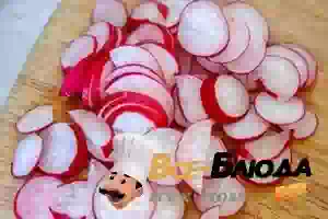 3. Редиску порезать примерно так же как огурцы. Овощи и зелень смешать в салатнике, добавить пропущенный через пресс зубчик чеснока, приправить по вкусу солью и молотым черным перцем.