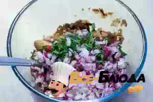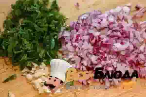 4. Мелко нарезать красный лук, зелень и очищенный чеснок.