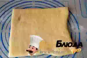1. Сначала приготовим домашние тарталетки из готового слоеного теста. Для тарталеток возьмём пластину готового слоёного теста, предварительно разморозив её не вынимая из упаковки. Аккуратно раскатаем тесто на рабочей поверхности, подпыленной мукой. Толщина слоя должна быть примерно 5 мм.