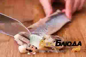 3. Филе соленой сельди нарезать небольшими кусочками.