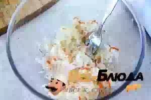 3. Квашеную капусту отжать, положить в салатник. Если вам кажется, что капуста слишком кислая, предварительно промыть её и откинуть на дуршлаг, чтобы избавиться от лишней влаги.