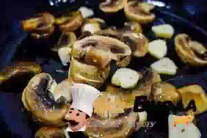 2. Разрезаем грибы на несколько частей. В сковороде разогреем 1-2 ст.л. растительного масла и жарим, помешивая, 5 минут. Добавляем к грибам измельченный чеснок, специи по вкусу и соль. Как только жидкость, выделившаяся из грибов, почти испарится, отправляем в сковороду, разобранную на соцветия и порезанную на небольшие кусочки, капусту брокколи.