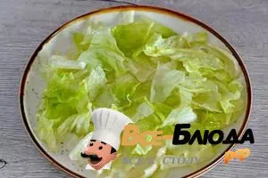 1. Листья зеленого салата промыть под проточной холодной водой, обсушить на кухонном полотенце, а затем порвать руками на небольшие кусочки и разложить по порционным тарелкам.