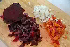 3. Свеклу и морковь порезать так же как картофель. Лук мелко порубить.