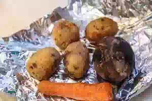 1. Овощи (свеклу, морковь и картофель) вымыть, обтереть досуха бумажным полотенцем и по отдельности завернуть в фольгу. Положить на противень и поставить в предварительно разогретую до 200С духовку примерно на 1 час. Переложить печеные овощи на тарелку, дать остыть и срезать кожуру.