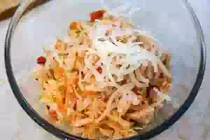 3. Квашеную капусту отжать, положить к остальным овощам и перемешать. Добавить нарезанный тонкими полукольцами лук.