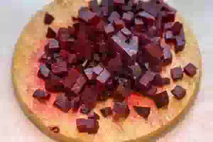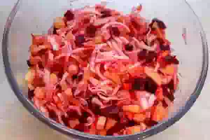 5. Свеклу, порезанную кубиками, добавить к остальным овощам.