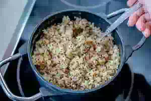 2. Пока варится картофель, приготовить крупу. Киноа несколько раз промыть в холодной воде, засыпать в кастрюлю, залить холодной водой в соотношении 1:2 и поставить кастрюлю на плиту. Как только вода закипит, посолить, уменьшить огонь до среднего и варить под крышкой до готовности, т.е. пока вода полностью не выпарится. Обычно для варки киноа достаточно 20 минут. Или смотрите в инструкцию на упаковке, и следуйте ей.