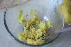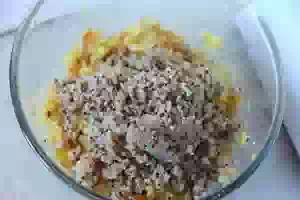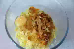 6. К этому времени картофель и крупа уже будут готовы. Картофель в мундире очистить. Каждую картофелину либо натереть на мелкой терке, либо просто хорошо размять вилкой. Котлеты из киноа с картофелем, Шаг 06 Добавить к картофельной массе овощную поджарку и яйцо. Хорошо размешать, посолив и поперчив по вкусу.