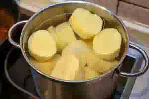 1. Картофельные котлеты из пюре с колбасой и сыром, Шаг 01 Картофель очистить, крупные картофелины разрезать на несколько частей, мелкую оставить целой. Вскипятить воду, посолить и положить очищенную картошку. Варить до готовности.