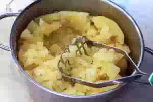2. С вареного картофеля слить воду и размять в пюре. Оно не должно быть очень влажное, иначе котлеты могут расползтись.