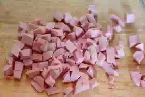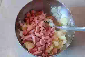 3. Колбасу, сосиски и сардельки порезать мелкими кубиками.